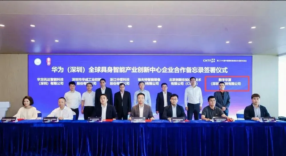 国内人形机器人创企[数字华夏(深圳)科技有限公司](以下简称“数字华夏”)作为深圳人形机器人“八大金刚”之一;公开资料显示,数字华夏自成立以来,一直与华为系保持着密切关系。2024年9月,北京国际通信展华为展台使用了两台数字华夏的人形机器人。同年11月15日,华为全球具身智能中心在宝安成立,第一批签约的16家合作伙伴,数字华夏又是唯二的两家本体公司。