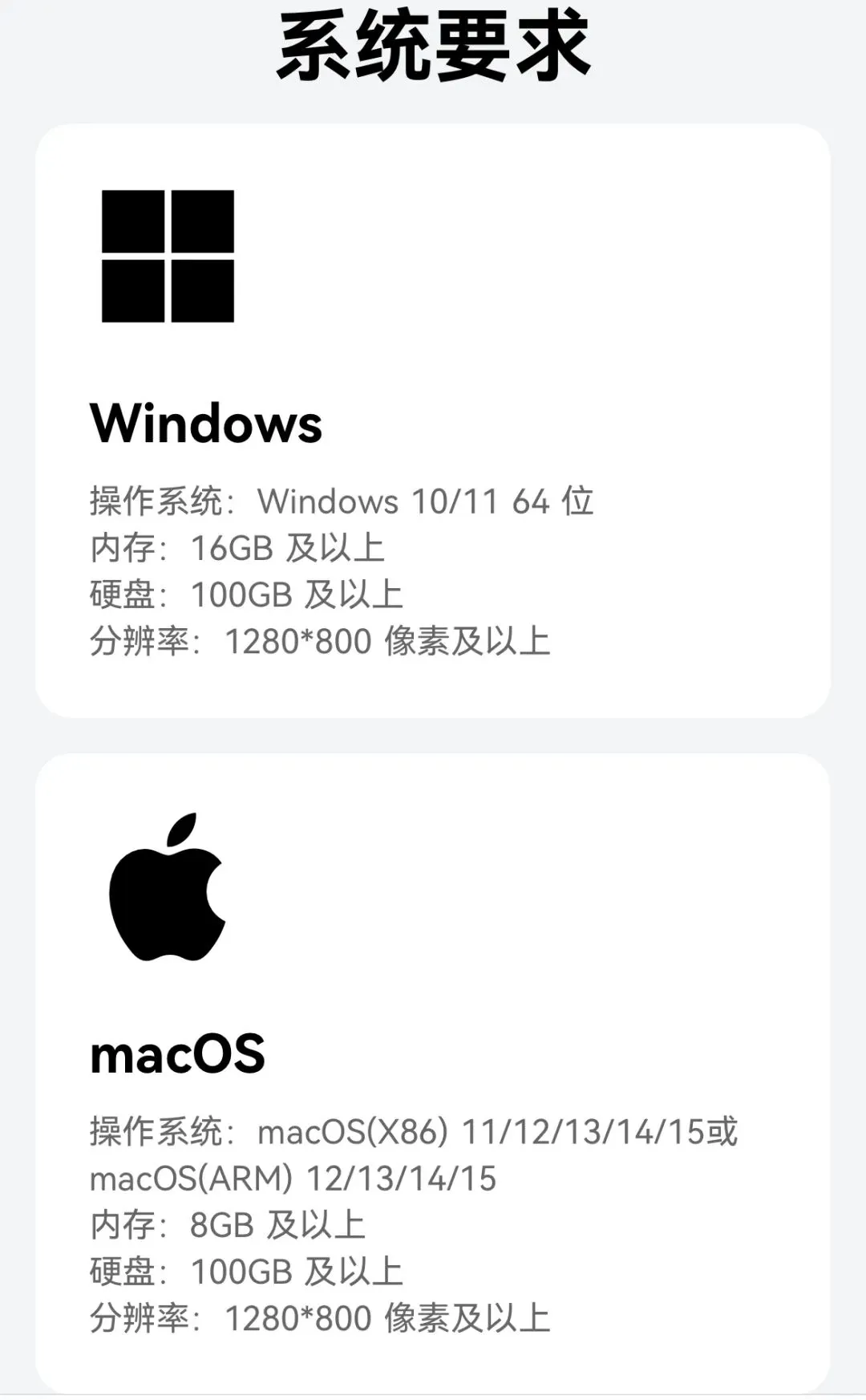 • 系统:Windows 10+ 64位 / macOS 10.14+;内存≥8GB(推荐16GB);硬盘≥10GB可用 (目前暂不支持Linux系统,公司有条件,直接上mac机)