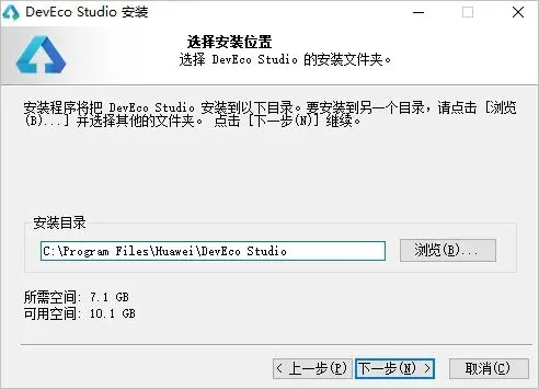 ◦下载完成后,双击下载的“deveco-studio-xxxx.exe”,进入DevEco Studio安装向导。在如下界面选择安装路径,默认安装于C:\Program Files路径下,也可以单击浏览(B)...指定其他安装路径,然后单击下一步。