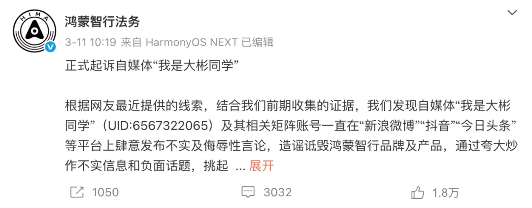 此案立案可追溯至2025年3月11日,彼时鸿蒙智行法务即公开宣布,根据网友举报线索及自行取证,发现“我是大彬同学”及其矩阵账号长期散布不实及侮辱性信息,刻意放大负面议题、煽动对立情绪,严重拉低品牌社会评价。面对起诉,该自媒体当日曾发文称“很抱歉占用公共资源”,并表示将积极应诉,同时质疑“鸿蒙智行法务”主体资格及案件受理法院等信息。