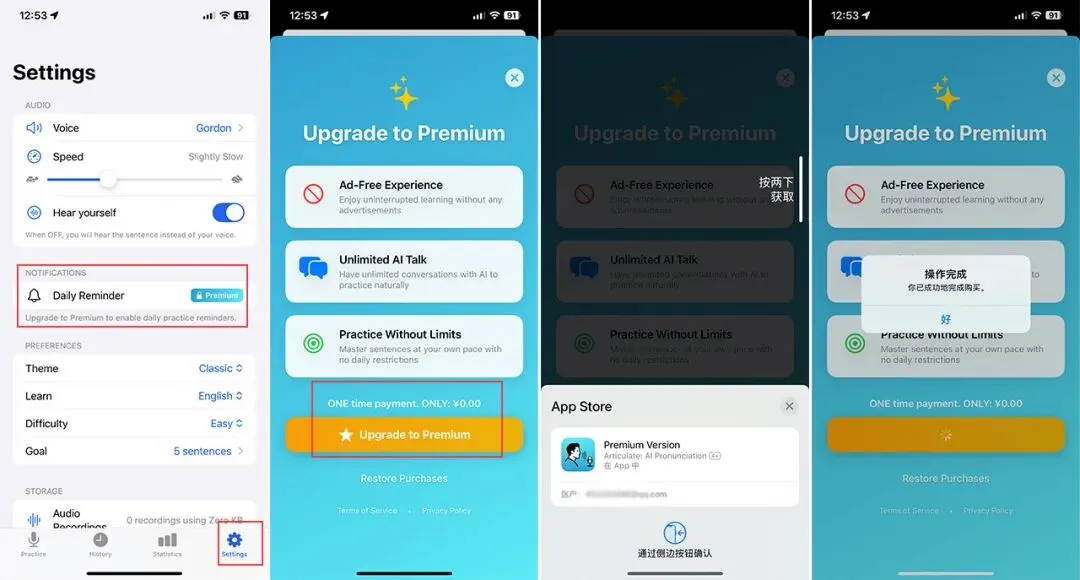 1,打开 App,按引导一步步继续,点击右下方 设置 按钮进入。之后点击上方 Premium 选项,进入内购页面。