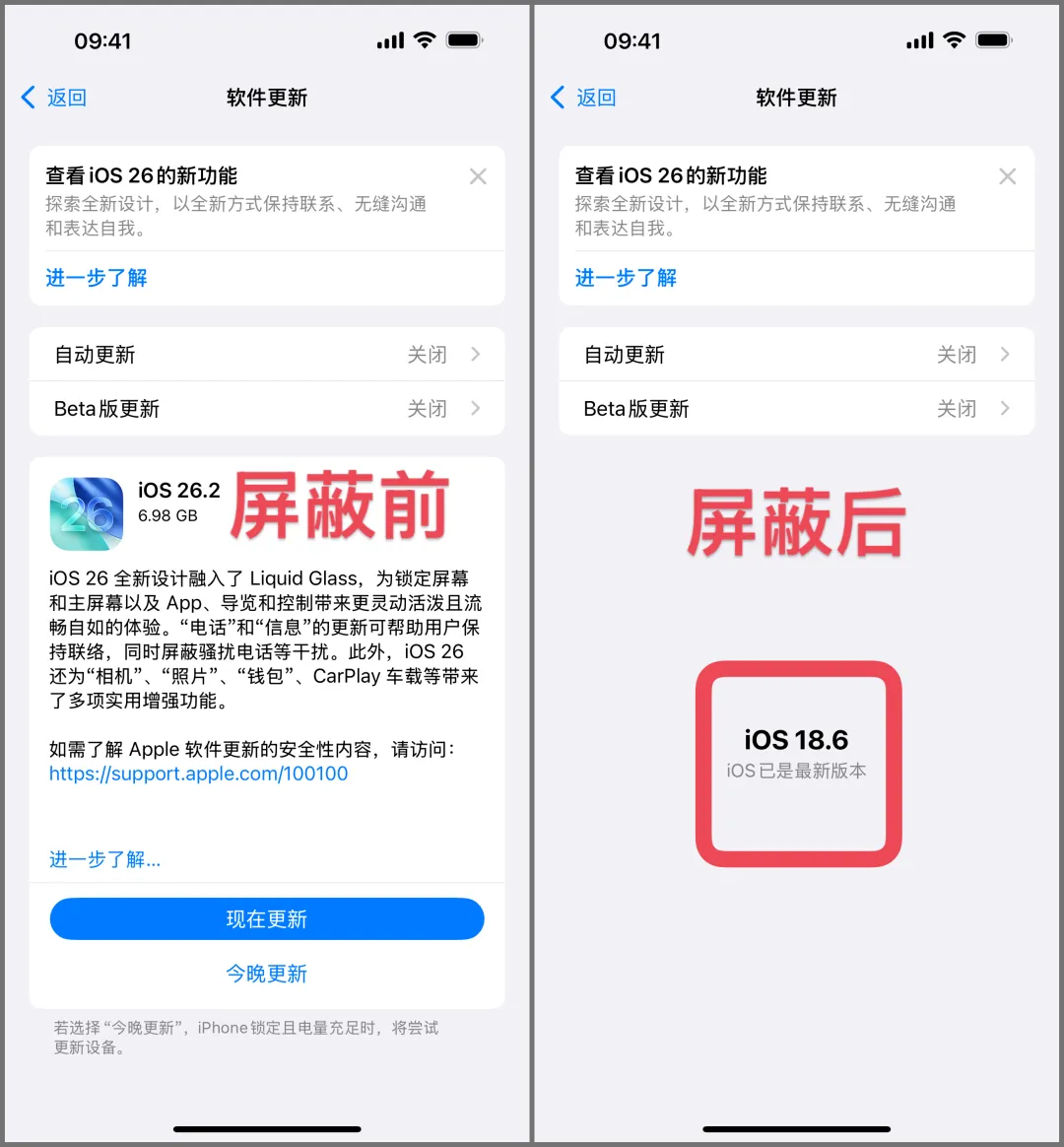 苹果官方发布屏蔽iOS26系统更新方法