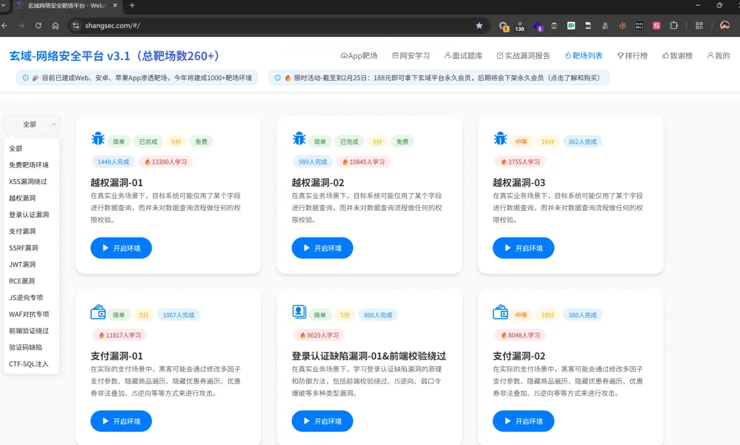 再到2026年1月正式版上线,经过1年多的持续迭代和优化,目前已建成web漏洞靶场、安卓App漏洞靶场、苹果App漏洞靶场,面试刷题系统、实战漏洞报告板块,且总计已建成260+靶场环境,且今年将建成1000+靶场环境!