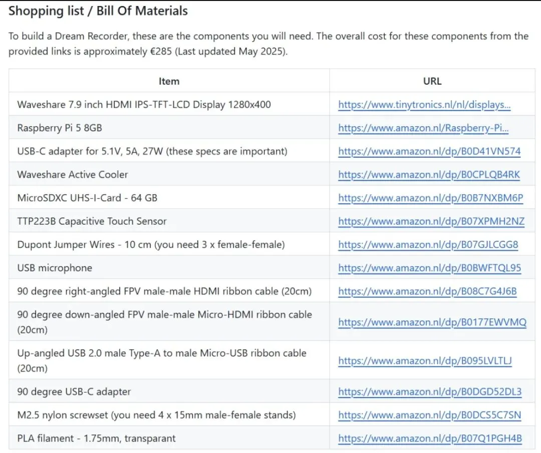 更贴心的是,这套设备软硬件全开源,GitHub 上就能直接扒代码和组装图纸,用 3D 打印个外壳,拼上普通电子零件就行,不用懂焊接,DIY 成本 285 欧元左右。而且不用连手机,开机就能用,能存一周的梦境视频,想回看随时就能看。