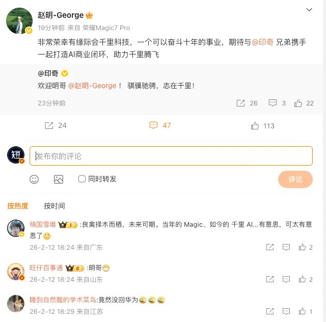 荣耀前CEO赵明发微博公布已加入千里科技董事会,后续工作重点在于推进ai商业模式的闭环战略。