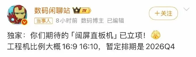 2 月 11 日,有消息称华为阔屏直板机正式立项,预计 2026 年 Q4 国内首发。该机被称为 “不能折叠的 Pura X”,将采用 16:10 的阔屏设计。