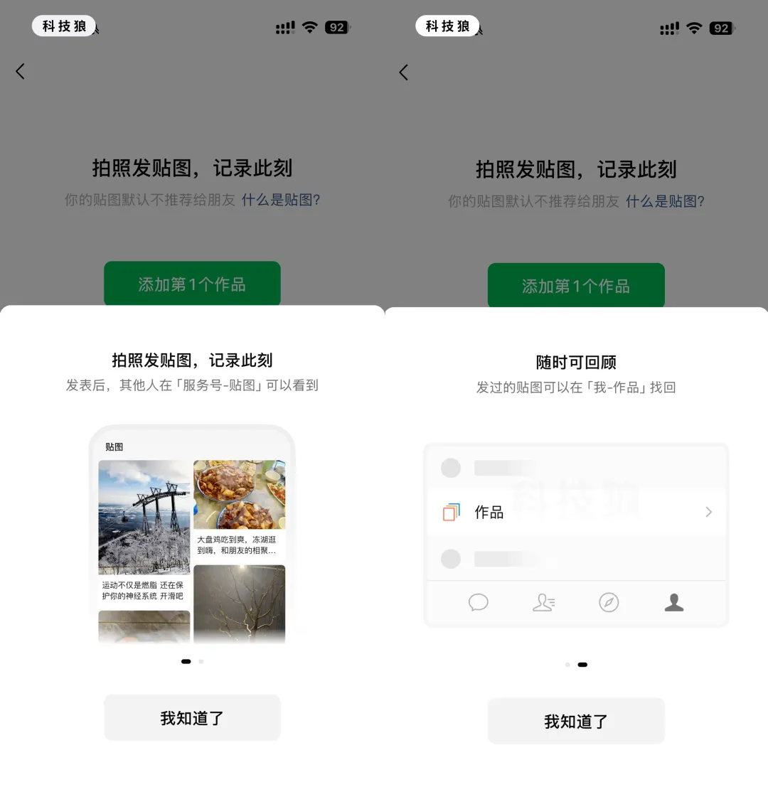 首先是,在微信-我的页面,新增了「作品」专属界面,里面主要记录了你发过的贴图,这个贴图其实就是之前的公众号图片消息,现在可以直接在这里发布或查看。
