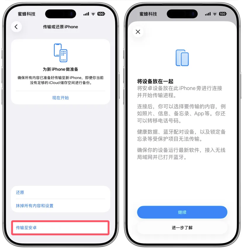 在 设置 >通用 >传输或还原iPhone,新增「传输至安卓」选项。无需安装第三方应用,将数据迁移到另一台安卓设备, 例如照片、信息、备忘录、App等。