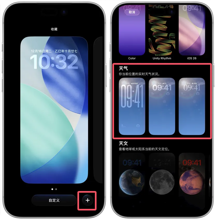 在天气壁纸单独分类,每一款壁纸都搭配专属的时间字体与天气小组件。