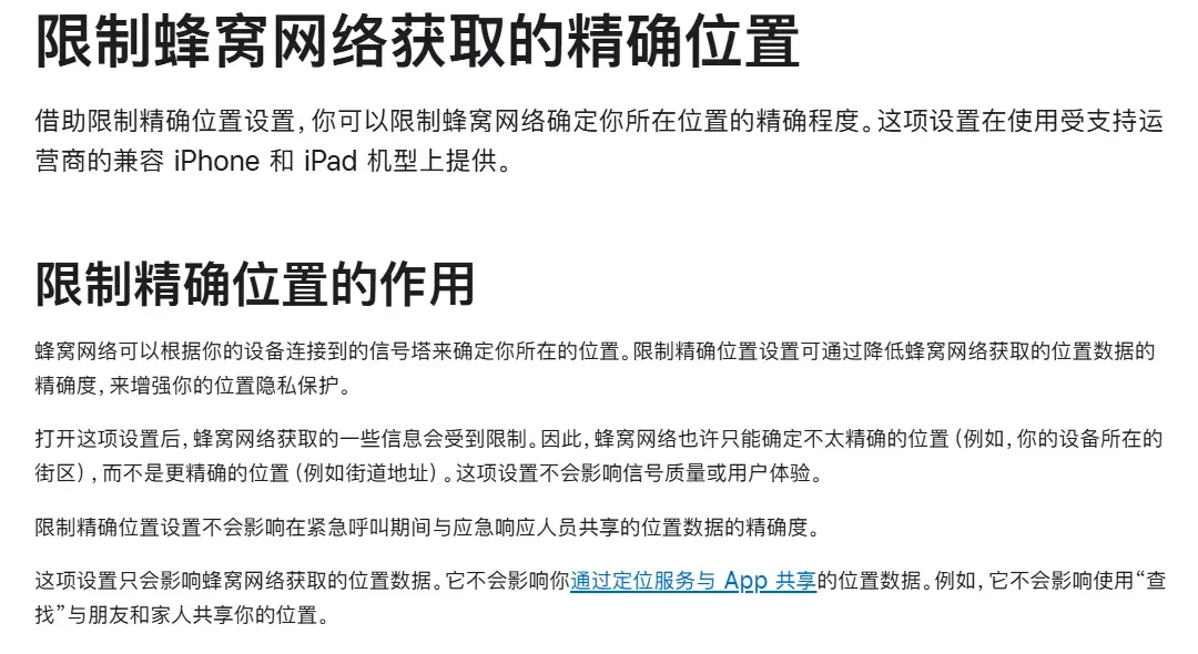蜂窝网络可以根据您的设备连接的蜂窝塔来确定您的位置。限制精确位置设置通过降低蜂窝网络可以获得的位置数据的精度来增强您的位置隐私。