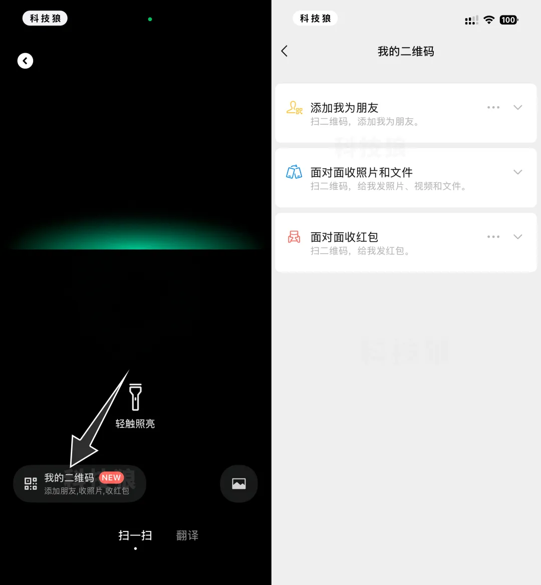 被灰度测试到的用户,在微信扫一扫界面的左下角,就能看到原本的我的二维码按钮已经变大了,预示着里面不仅有我的二维码,还有「面对面收照片文件」、「面对面收红包」,共 3 个功能。