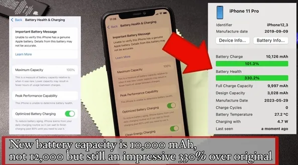 该博主还明确表示,在换装新电池并开机用了一段时间后,并未碰到任何兼容性问题,一切正常,但也有细心网友发现,兼容性也不是完全没问题,因为在博主将iPhone 11 Pro开机后,在系统中显示了330%的电池容量,证明新电池并未有效通过系统识别,后续无法查看健康度,但有并不影响正常使用。