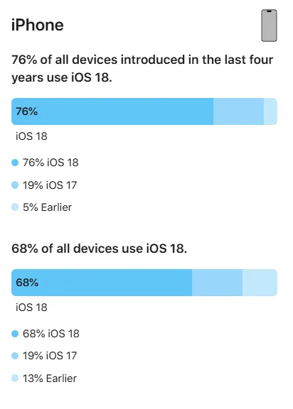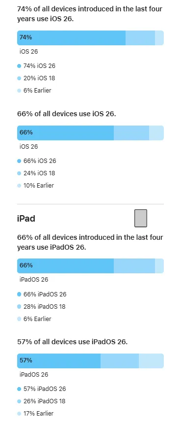 你升级iOS 26系统了吗?苹果公司目前已经公布了iOS 26和iPadOS 26系统的普及率数据,详细展示了运行这些软件版本的iPhone和iPad设备数量情况。苹果方面表示,此次公布的普及率数据统计依据是2026年2月12日在App Store上有交易行为的iPhone和iPad设备。在所有过去四年内推出的iPhone中,有74%的设备运行着iOS 26系统;而在全部iPhone设备中,运行iOS 26的比例为66%。对于iPad设备,过去四年内推出的iPad里,66%运行着iPadOS 26系统;全部iPad设备中,运行iPadOS 26的比例是57%。作为对比,去年同期iOS 18系统和iPadOS 18的安装率分别为:过去四年内推出的iPhone中,有76%运行iOS 18系统;全部iPhone设备中,运行iOS 18的比例为68%。过去四年内推出的iPad里,63%运行iPadOS 18系统;全部iPad设备中,运行iPadOS 18的比例是53%。乍一看,iOS 26和iOS 18的安装率数据似乎较为接近,但实际上并非如此。要知道苹果公布iOS 26统计数据的时间比以往要晚,iOS 26的统计数据是基于该更新向公众发布约150天后在App Store有交易行为的设备得出的,而iOS 18的统计周期仅为127天。也就是说,iOS 26多出了大约三周的普及时间。也就是说,iOS 26的普及速度实际上比iOS 18要慢。目前,尚无法确切知晓iOS 26普及速度较慢的原因,但有部分用户表示,他们暂时选择不升级系统,以避开新的“液态玻璃(Liquid Glass)”设计风格。再看iPadOS 26,从数据上看,其普及率在技术层面高于iPadOS 18。但同样需要注意的是,iPadOS 26也受益于多出的这三周可用时间。iPhone17已经上市,256GB起步,6.3寸更大屏幕,120HZ高刷等良心升级,今年肯定会大卖!如果您家里有闲置手机趁现在高价出掉,很多人把闲置的手机一直放着,最后只能换不绣钢脸盆!(估价满意后再加回收专员:gfzjxm)