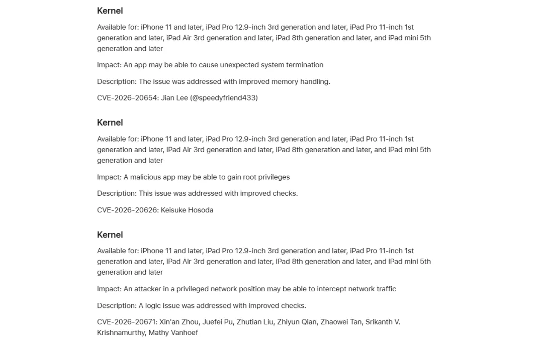 在2月12日上午时段,苹果发布 iOS 26.3 正式版系统,此系统一共修复 37 个漏洞,其中就有三个内核漏洞。