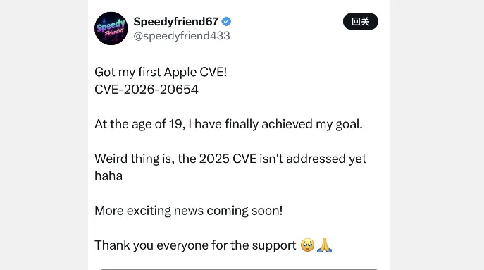 这三个内核漏洞提交名单中,就有 speedyfriend433 这位大佬,这是真的,苹果官方显示提交名单不会有假,该漏洞已在 iOS 26.3 版本中被修复。更难得的是,他年仅 19 岁,还有极大的自学提升空间,未来能发掘出更多漏洞。