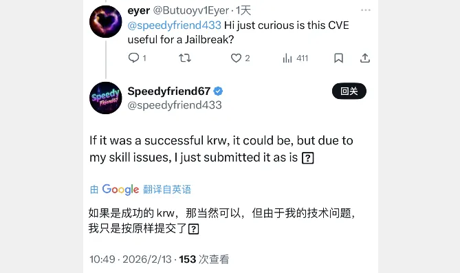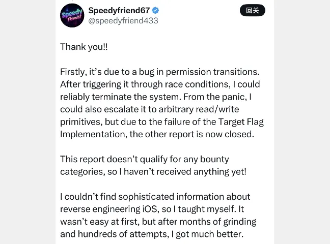 speedyfriend433 大佬自学发现内核漏洞,越狱可能有望。