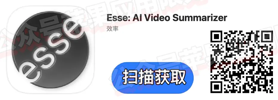 软件名称:Esse: AI Video Summarizer一款 AI 视频总结工具,目前可以通过兑换码免费获取它的终身订阅,名额有限,如果显示无法兑换,说明已经兑换完了,设备需装有 iOS 15.1 或更高版本。