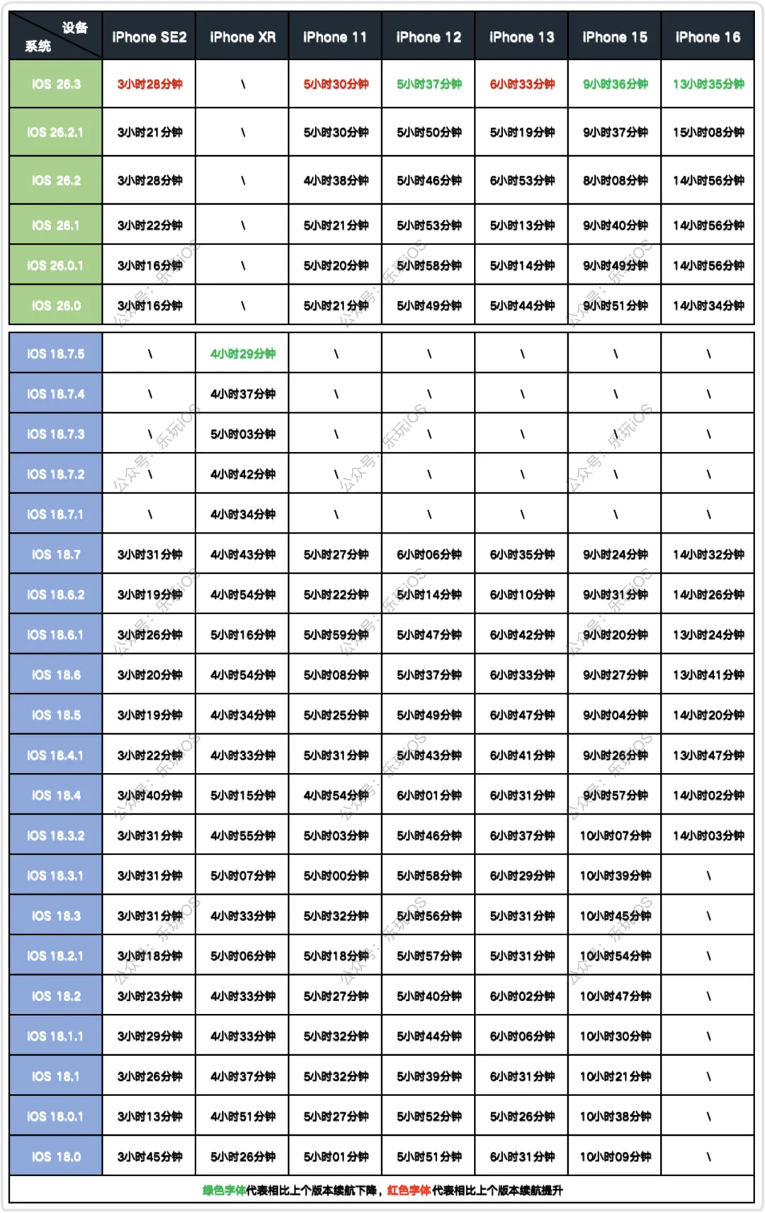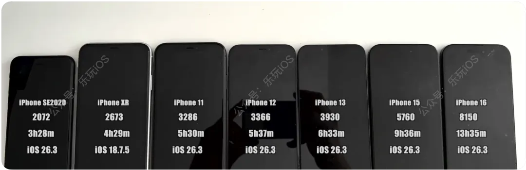 iOS 26/18系统历史各版本及各设备续航测试列表