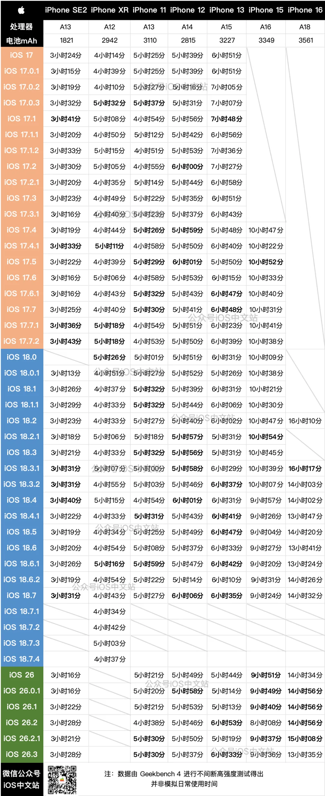 上方是iOS17、 iOS18所有版本、到目前 iOS26.3 的续航实测时间,大家自行对比。注意:要考虑电池健康度逐渐下降的问题,所以对比相近的版本比较合理