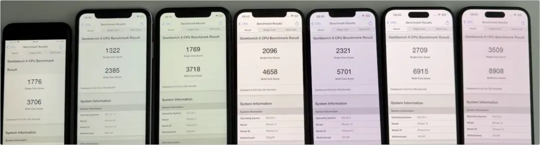 使用 Geekbenk6 进行单多核跑分,单核影响高强度任务和游戏性能,多核影响多任务处理的流畅度iPhone 16 和 iPhone 15 和 iPhone 13 的跑分大幅提升,是目前最好的成绩iPhone 12 和 iPhone 11 跑分稳定,变化不大iOS26.3 正式版中,所有机型的跑分都是稳中有升,说明这个版本的理论性能表现比较好。不过,这个版本的续航出现较大改变🤔 iPhone 16 续航大幅削弱,但跑分处于最高状态✅ iPhone 15 续航稳定,跑分提升,可以升级✅iPhone 13 续航提升,跑分提升,可以升级❌ iPhone 12 续航降低,跑分不变,不建议升级🤔iPhone 11 续航和跑分都稳定,可考虑升级🍎这里是iOS中文站↓新来的老铁请扫码关注,以后经常带来实用评测