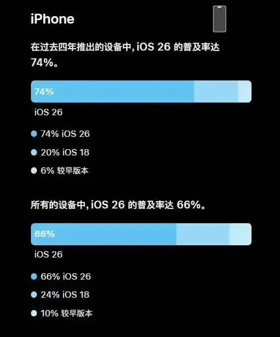 如果把所有还在服役的 iPhone 都算上,包括那些更早的型号,iOS 26 的整体安装比例是 66%。