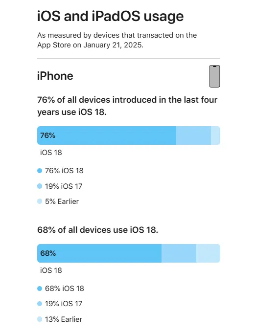苹果之前在 2025 年 1 月公布过 iOS 18 的数据:发布后大概 127 天,过去四年 iPhone 的升级率是 76%,全机型是 68%。
