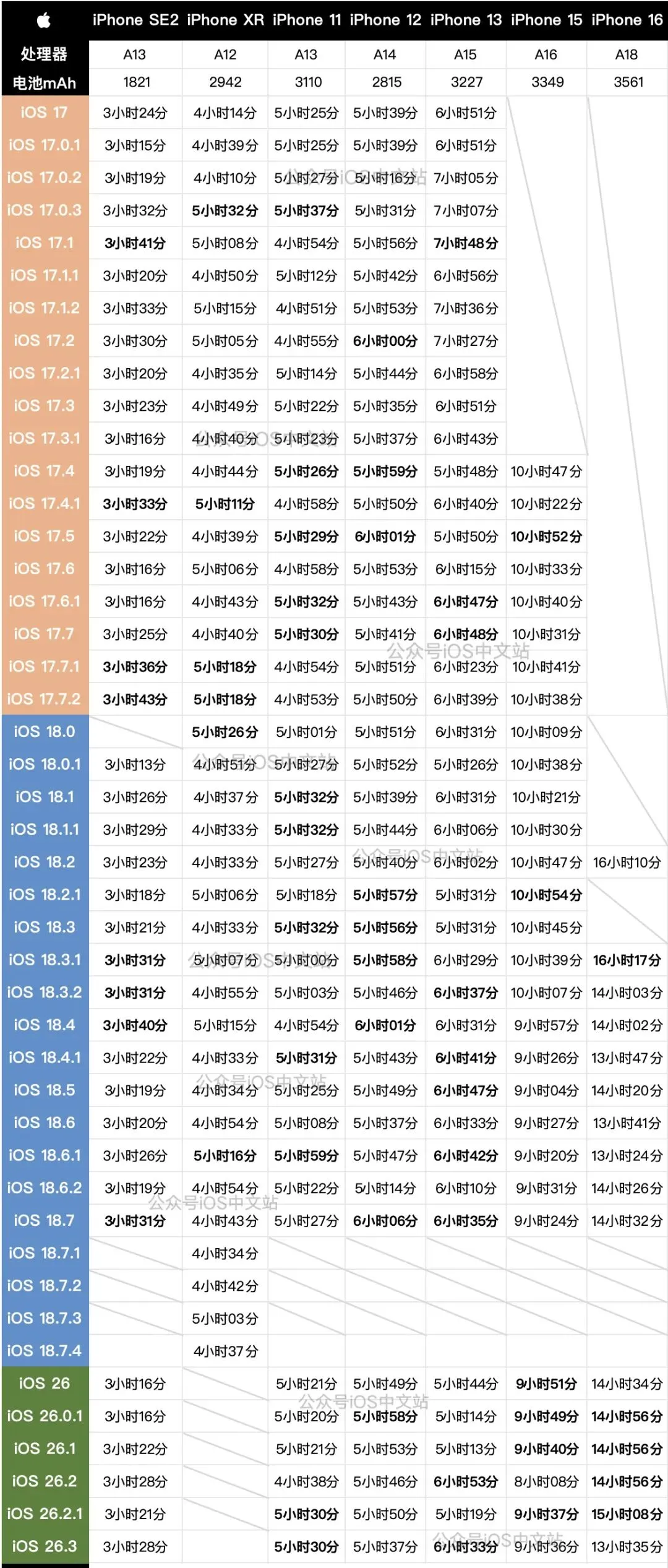 • iPhone SE 2:续航小幅提升7分钟,追平iOS 26.2的最高水平,日常轻度使用感知不明显
