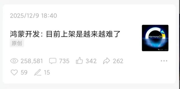 HarmonyOS干货铺:只分享鸿蒙相关的精华技术文章,千帆起航,共筑鸿蒙!一个服务于鸿蒙开发者的应用【鸿元极客】已经上架,欢迎大家去应用市场搜索下载体验。回顾2025年,这一年有过惊喜,也有过失落,有过颓废,也有过进取,这一年的鸿蒙,我不再局限于文章和组件的贡献,也拓展了插件和应用的开发,让自己在多方位的角度来不断的汲取。