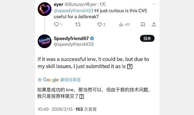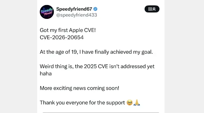 昨天就提到!speedyfriend433 大佬在 iOS 26.2.1 及更低系统中,发现新的内核漏洞,此漏洞已经提交给苹果,意味着在 iOS 26.3 系统中已修复,挺厉害的,年龄才19岁,自学发掘iOS内核漏洞。