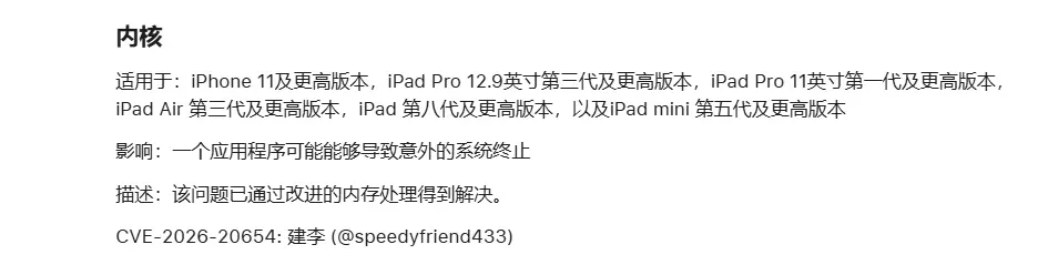 此漏洞为 CVE-2026-20654 漏洞,能够一个应用程序导致意外的系统终止,支持 iOS 26.2.1 及更低系统。