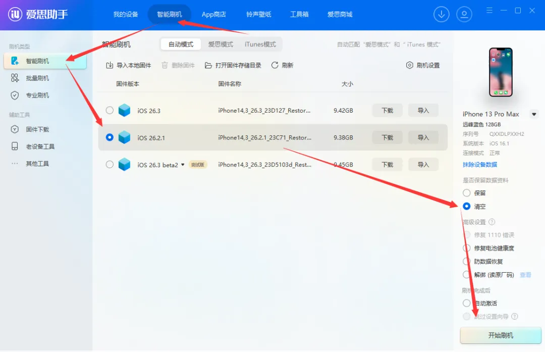 在电脑上下载爱思助手,打开爱思助手工具,找到智能刷机,勾选 iOS 26.2.1 系统,再勾选数据清空,不建议保留降级,有概率会失败的,接着点击开始刷机即可,iOS系统降级非常简单。