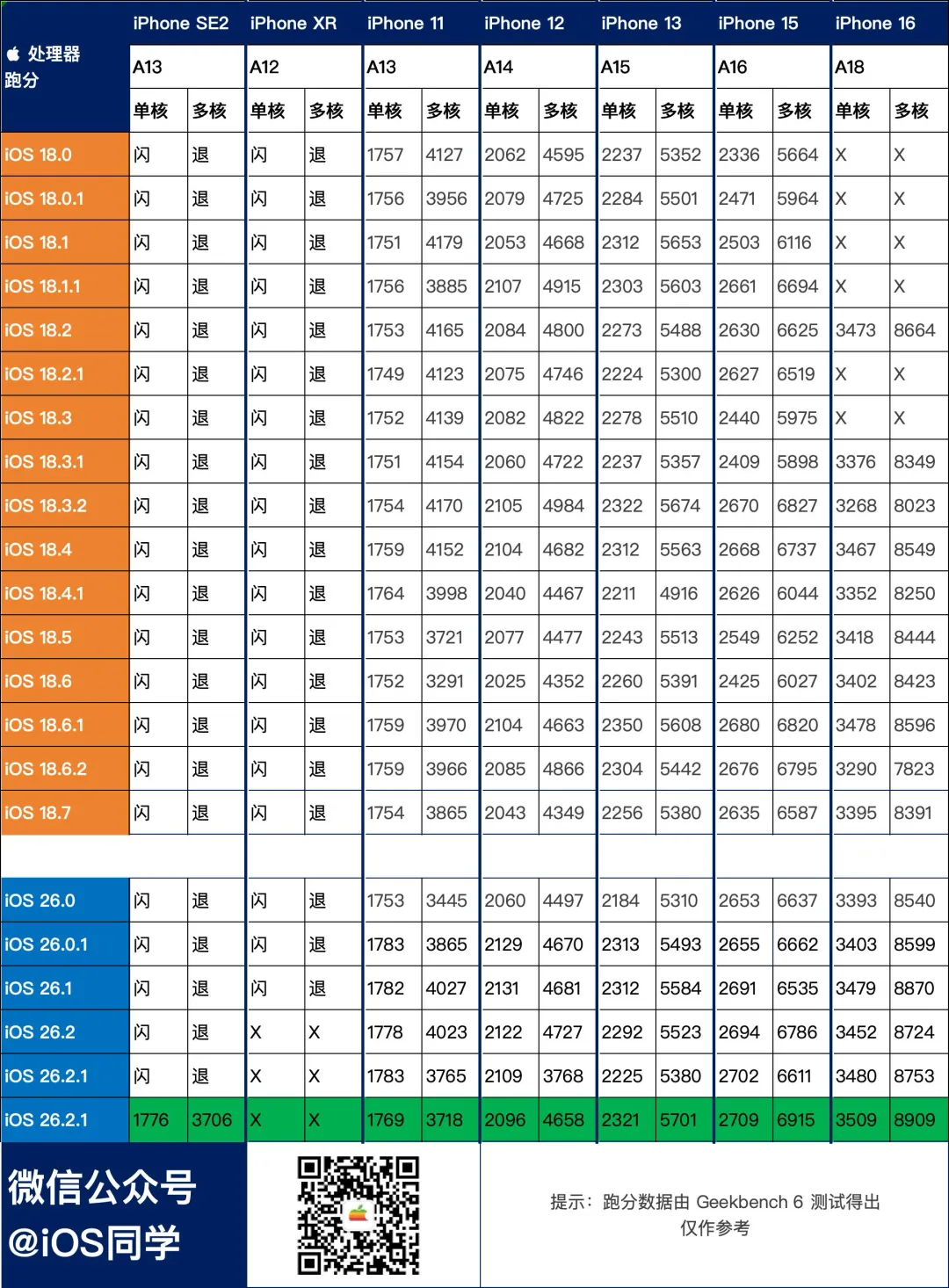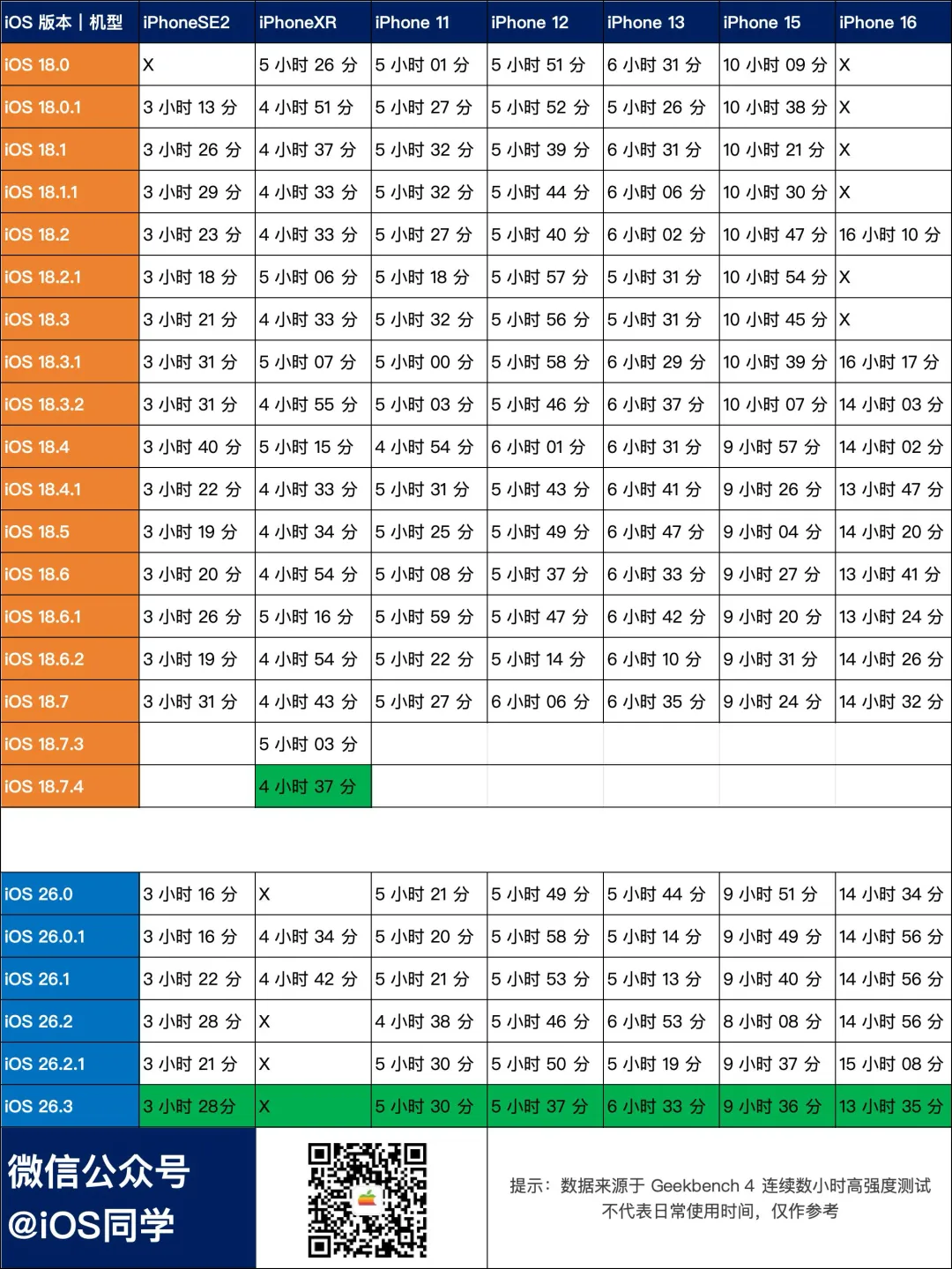 以上为 iOS18 和 iOS26 所有版本的续航数据,大家可作参考。