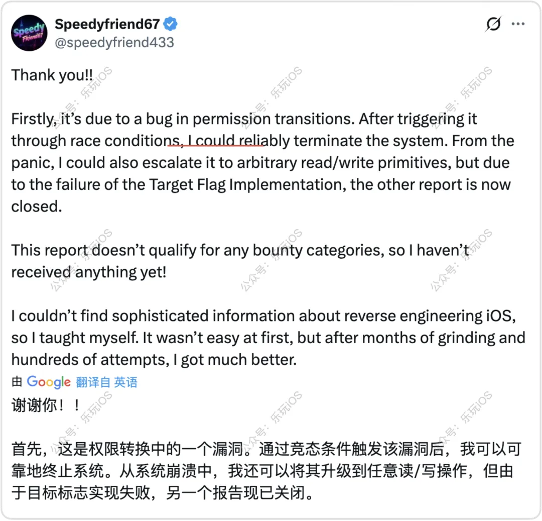 也在社媒X上进行了分享,这位大佬属于是自学派的,并独立挖掘出了内核漏洞