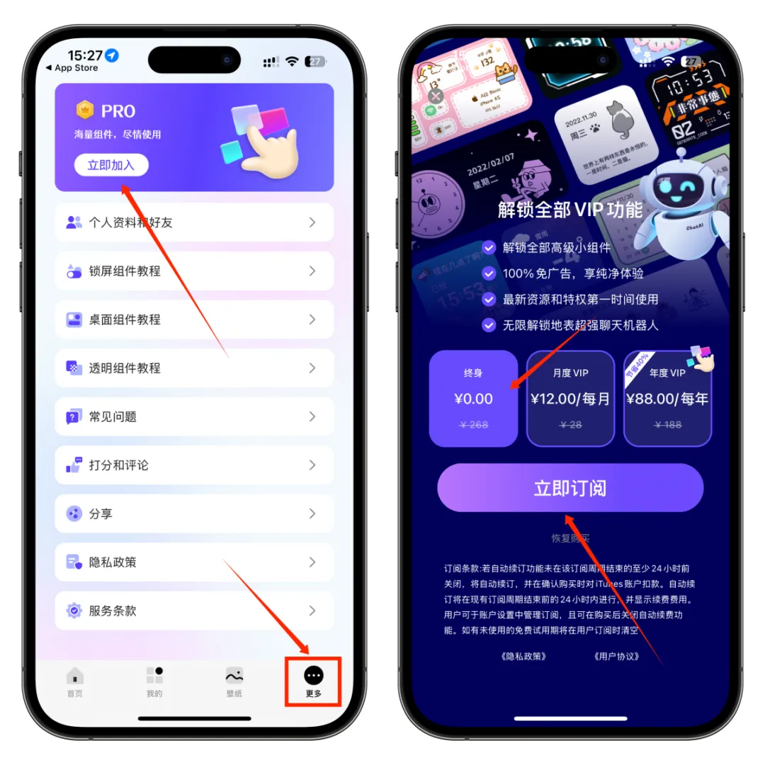 高级会员版获取:进入软件首页,点击底部右下角的【更多】按钮,点击【立即加入】,选择【终身 ¥0.00】,然后点击订阅,完成之后就会提示成功,所有高级功能已解锁。