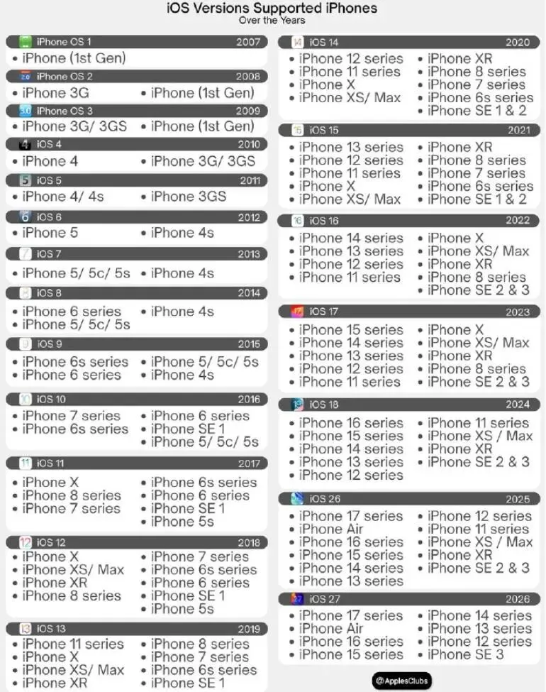 果粉们,你们手上的iPhone还能升级到最新系统吗?ApplesClubs 最近整理了一份从iPhone OS 1到iOS 27的完整支持机型列表,看完让人感慨万千。从2007年第一代iPhone只能运行iPhone OS 1,到2026年传闻中的iOS 27可能只支持iPhone SE 3及更新机型,苹果的系统支持策略发生了巨大变化(表格在结尾展示)。