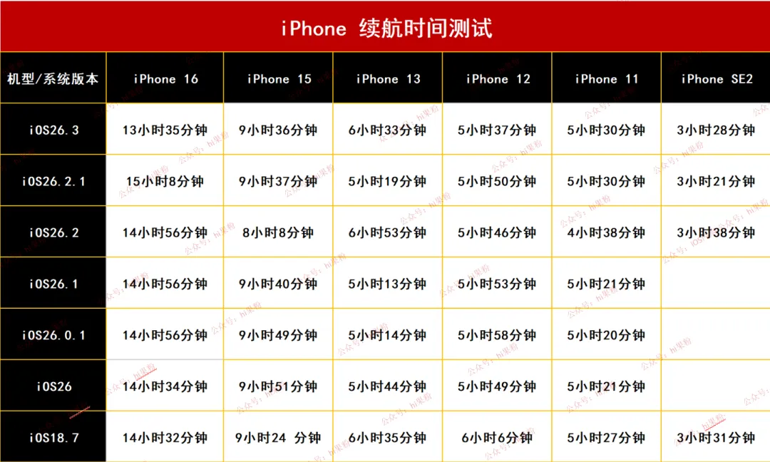 2、以上数据是 iOS 26.3 正式版测试结果,不代表日常使用最终结果,仅供参考;大家根据自己机型及续航测试表,考虑是否合适升级系统;