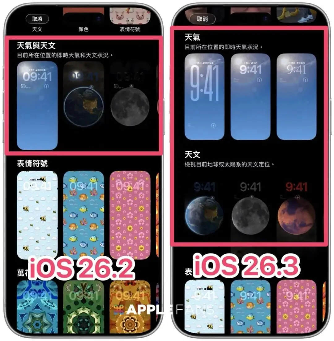 这次iOS 26.3 在桌布设定上也有贴心微调。原本挤在一起的「天气与天文」区块,现在正式独立拆分,找起来更顺手、不用再翻半天。