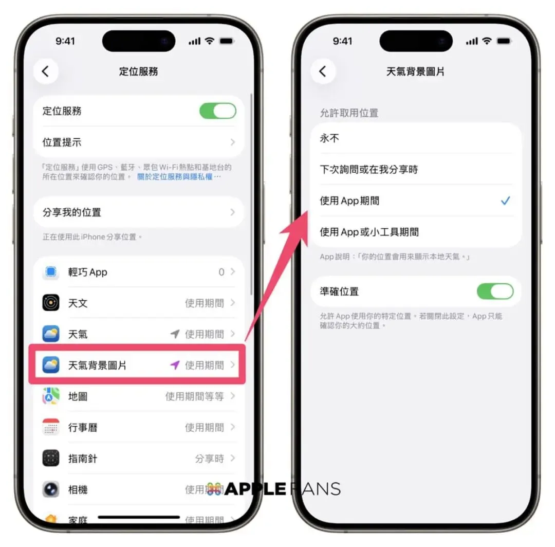 苹果为了让隐私更透明,也把天气动态桌布的「通行证」独立出来,让你决定「桌布」本身是否具备追踪位置的权力。现在进入到「定位服务」里会看到「天气背景图片」这个独立选项,你可以选择定位服务的取用权限。