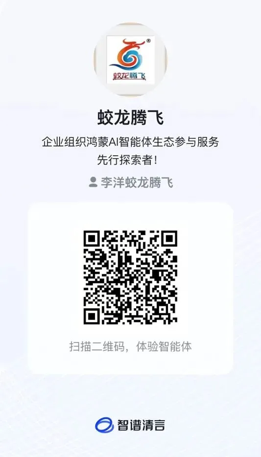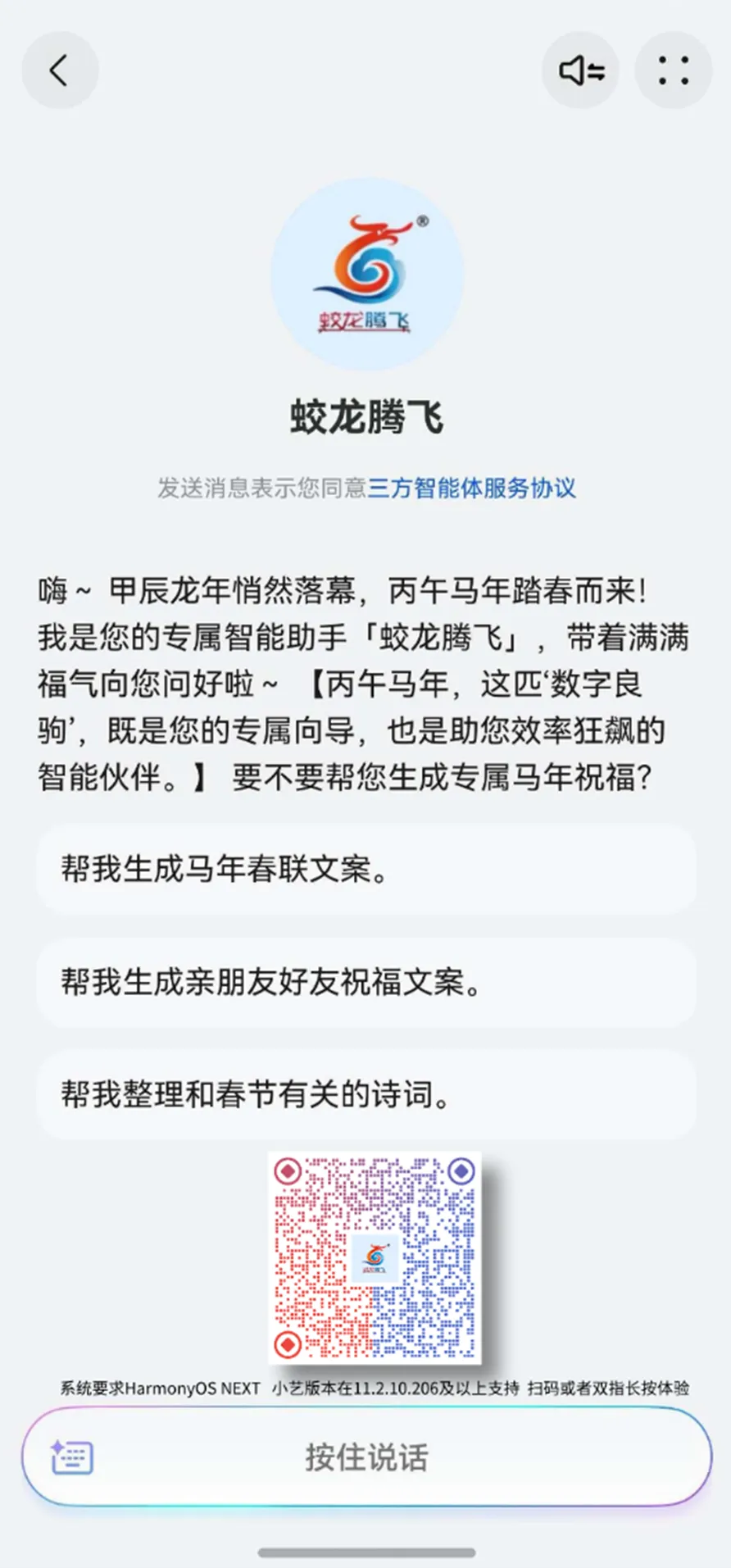 蛟龙腾飞鸿蒙智能体系统要求HarmonyOS5/6,小艺版本在11.2.10.206及以上,扫码或者双指长按体验。