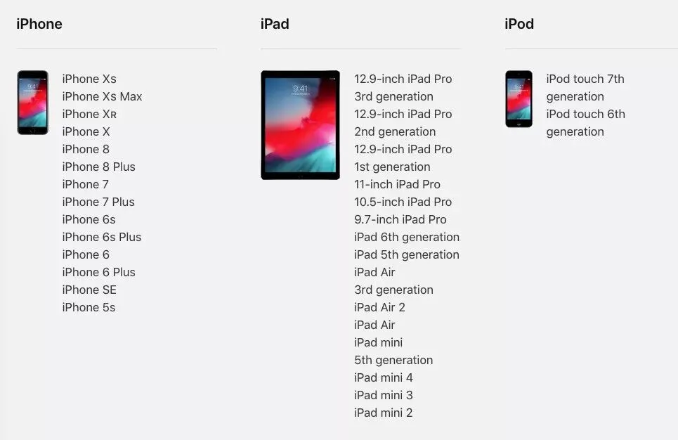 12.9英寸iPad Pro第二代、12.9英寸iPad Pro第一代、10.5英寸iPad Pro、9.7英寸iPad Pro、iPad Air 2、iPad Air、iPad第五代、iPad第六代、iPad mini 4、iPad mini 3、iPad mini 2。
