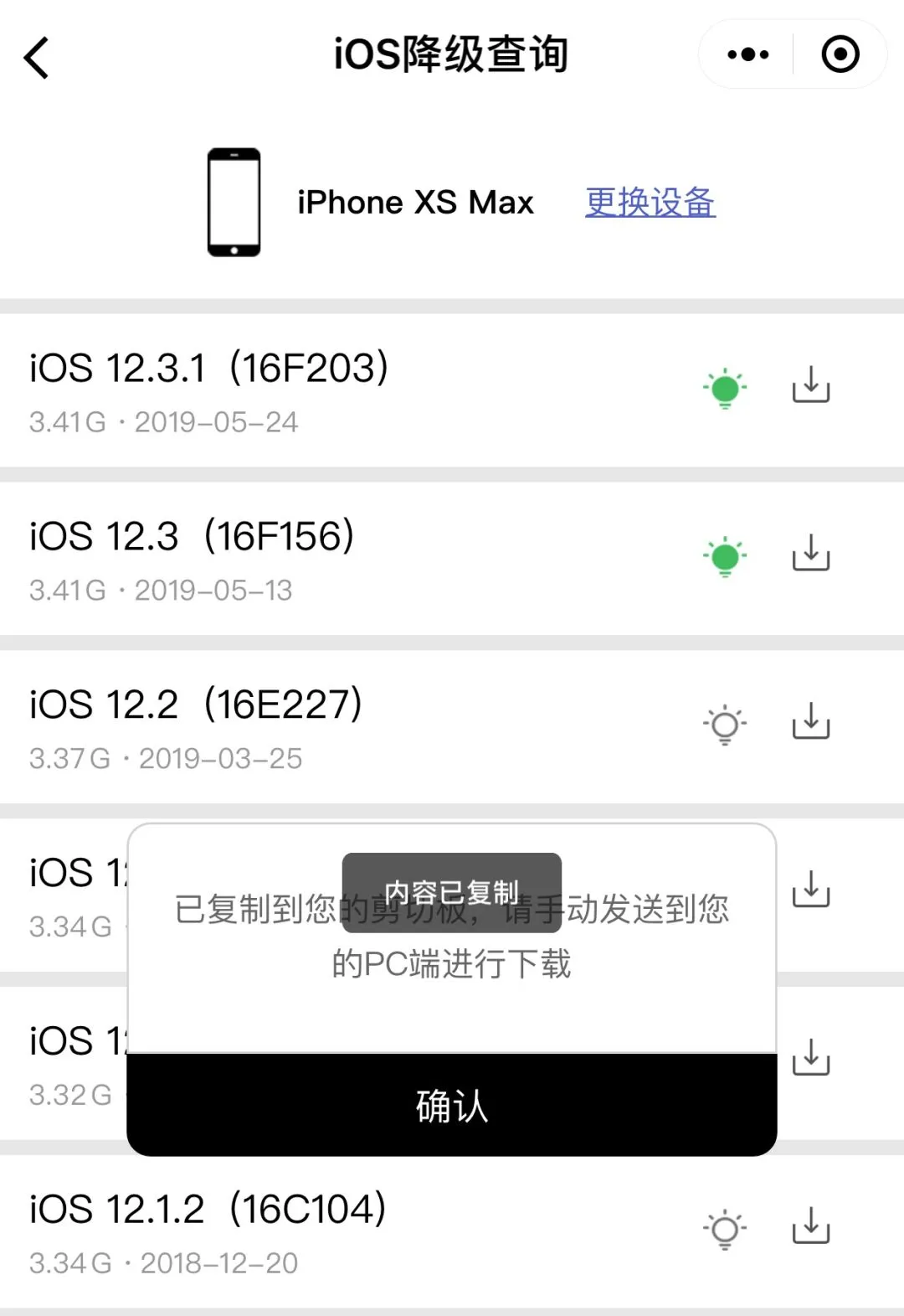 首先扫描下面小程序码,打开后选择需要降到的系统版本,点右边的下载图标复制链接。