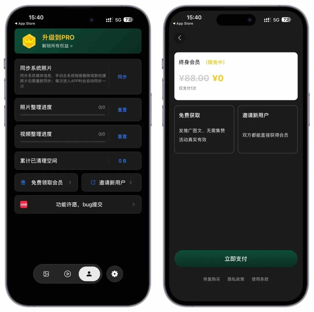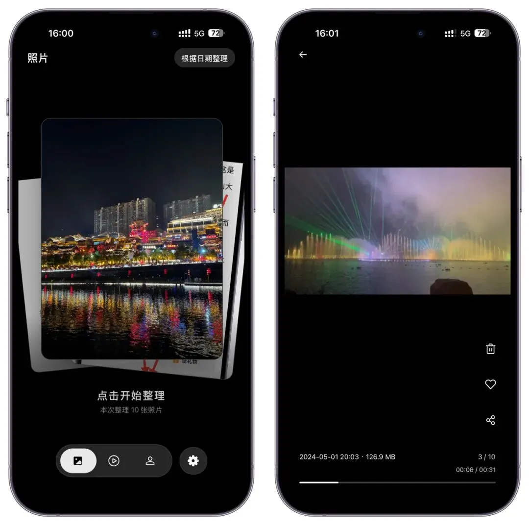 1、照片清理-像刷交友 APP 一样整理照片,左右滑动浏览照片,上滑删除、下滑收藏,操作简单直观。支持随机或按时问顺序展示,自动识别相似照片,帮你快速找出重复和连拍照片。