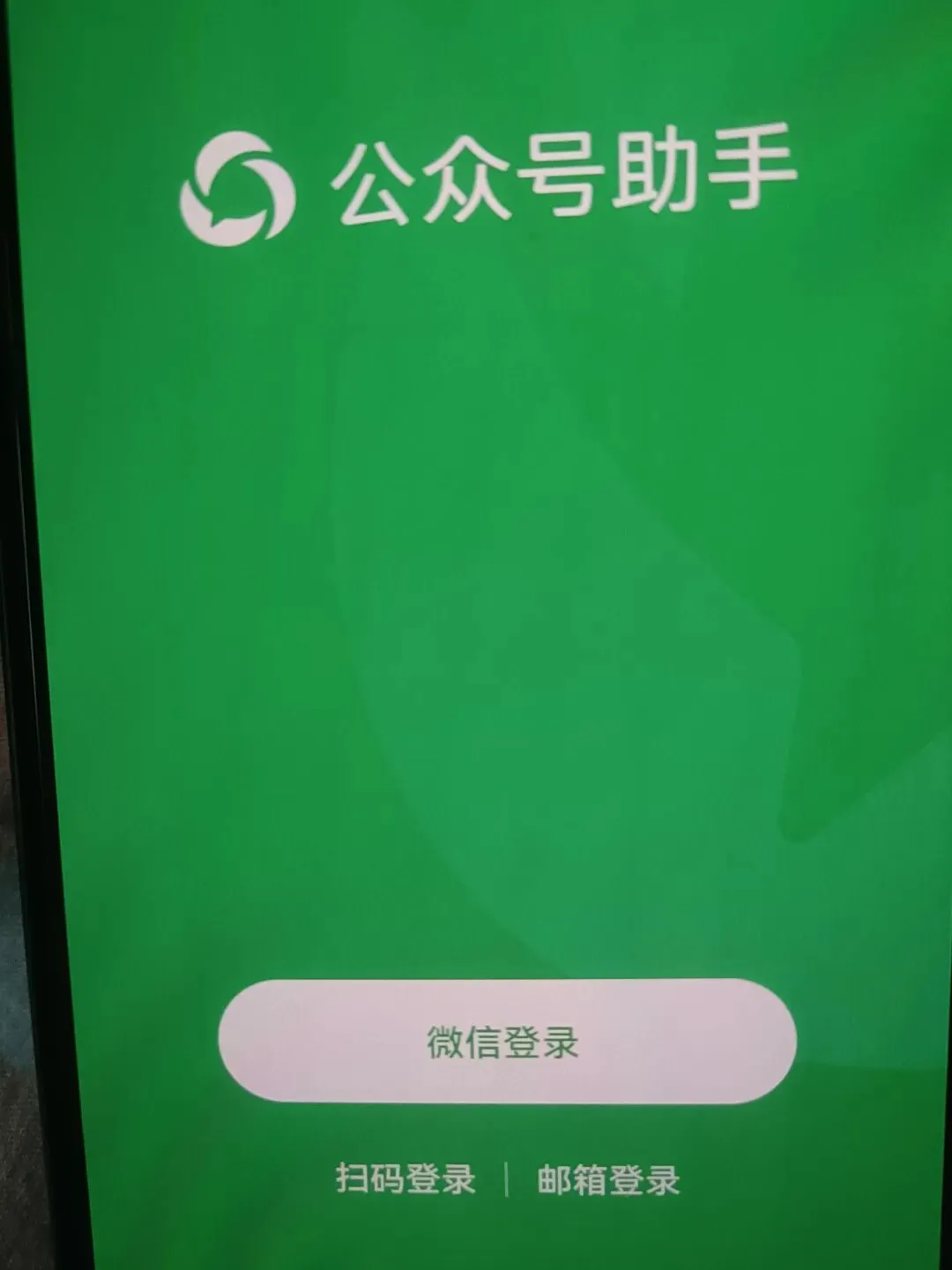 点击公众号助手登陆, 出现三种登陆方式分别是:微信登陆、扫码登陆、邮箱登陆。因为当初注册时关联微信账号并绑定了邮箱, 所以用微信直接登陆是最方便最快捷的方式了。