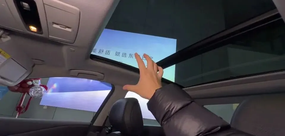 棚顶细节也安排了:眼镜盒、遮阳板化妆镜跟补光灯,并且是分段式天窗设计,有电动遮阳帘,冬天还能采光。