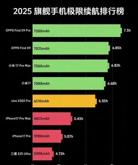 OPPO、小米、vivo包揽前三,而苹果iPhone 17系列再次垫底,这已经不是简单的”电池大小”之争,而是两种续航哲学的较量。