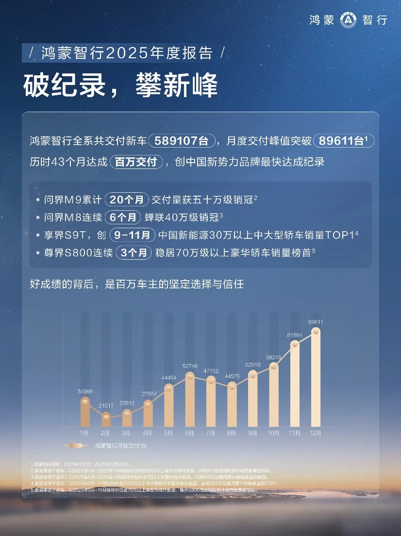 回顾刚刚过去的2025 年,中国高端汽车市场的竞争日趋激烈,新能源赛道的比拼更是持续提速升级,市场对品牌产品力和技术实力等方面的考验标准不断提高。而鸿蒙智行在30-70万+豪华车市场中表现尤为亮眼,旗下五界车型精准布局各价格区间,依托华为全栈科技赋能的硬核产品力,品牌全系仅用43个月便实现累计交付100万辆。这一成绩的背后,是鸿蒙智行始终坚持将高端科技转化为用户可感知的实际体验。同时,这也更深刻印证了中国高端汽车消费市场的核心转变——从以往注重品牌影响力带来的溢价,逐渐转向对真实用车体验的追求。