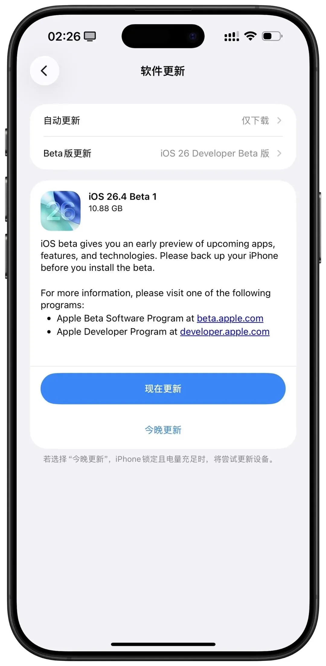 新增了为播放列表和专辑自动匹配封面相近颜色的背景。以及基于自然语言的 Apple Music 播放列表创建功能(需打开 Apple 智能)新增了 Apple Music 艺人的演唱会预告功能。还有两个「环境音乐」的小组件。在 设置 ➝ 邮件 ➝ 添加账户 页面中 Outlook 邮箱图标进行了更新,无边记 App 图标进行了重新设计,更新后与 Creator Studio 中的图标风格保持一致。此次版本的输入密码界面中,将图标、文字、密码都进行了居中,而之前版本则是除了图标其他都是左对齐。1. 修复了 App 打开时出现原始矢量 icon 的问题3. 修复了设置 App 返回上一页时 UI 消失的问题iOS 24. 第一个测试版本更新,部分 APP 不兼容会闪退。例如:豆包、烂番茄、夸克等等。iOS 26.4 第一个测试版本没有加入苹果智能功能,对不少功能选项进行优化,同时也出现不少 APP 不兼容闪退问题,暂时不建议更新。