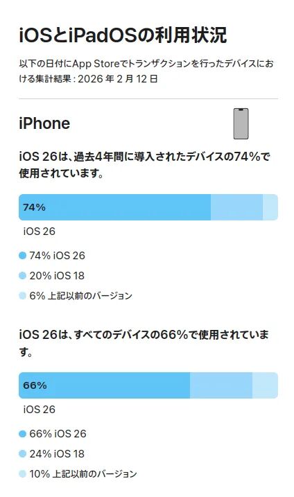 苹果公司会根据iPhone用户在App Store上进行购买和下载的设备,发布iOS使用情况统计数据。根据截至2026年2月的最新数据,iOS 26已覆盖过去四年内生产的iPhone的74% ,但仅覆盖所有iPhone的66%。iOS 26 安装率为 74%(所有 iPhone 的安装率为 66%)