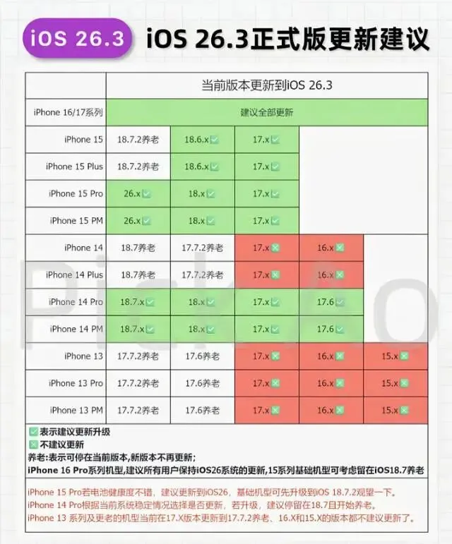 iPhone 12 和 iPhone 13 这两代走的是稳,升级前后续航对比差距不大,流畅度也没起伏,电池健康这个年纪,基本到了要盯着看的阶段,系统再怎么细调,化学老化还在那,给这两代的建议分两路,佛系用机,留在 26.2 照样日常,追安全补丁,按下 26.3 也行,风险不高。
