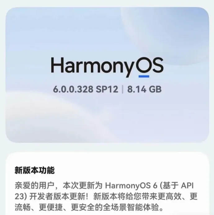 这次更新来自华为正在测试的 HarmonyOS 6 开发者 Beta 版本(基于 API 23),目前已经开始向 Mate 60 系列等设备推送,版本号为 6.0.0.328 SP12。那么问题来了:这么大的更新,到底升级了什么?它又意味着什么?